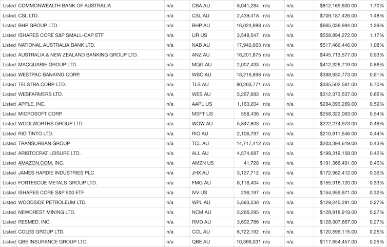 The Australian Retirement Trust’s Portfolio Holdings Disclosure for its “Lifecycle Balanced Pool”, for example, has more than 8000 line items.