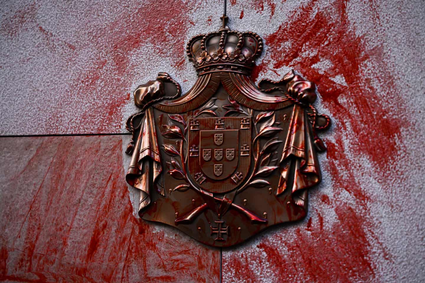 Red dye is smeared over a coat of arms at the British Consulate during an anti-monarchy protest. Photograph: Joel Carrett/EPA