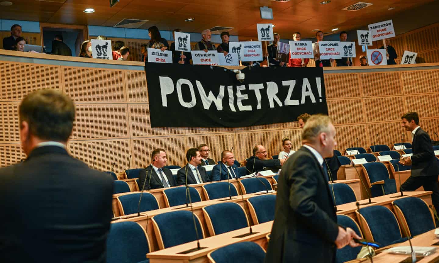 Activists hold banners during a Malopolska provincial session, as the council considers changes to a 2017 anti-smog resolution that campaigners say will allow citizens to burn any kind of fuel, even garbage, resulting in high levels of air pollution. Photograph: Omar Marques/Anadolu Agency/Getty Images