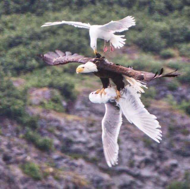 MemberPhotographer David Canales captured this photo while kayaking on Alaska’s Prince William Sound. A seagull attacking an eagle that has another seagull in its grasp.