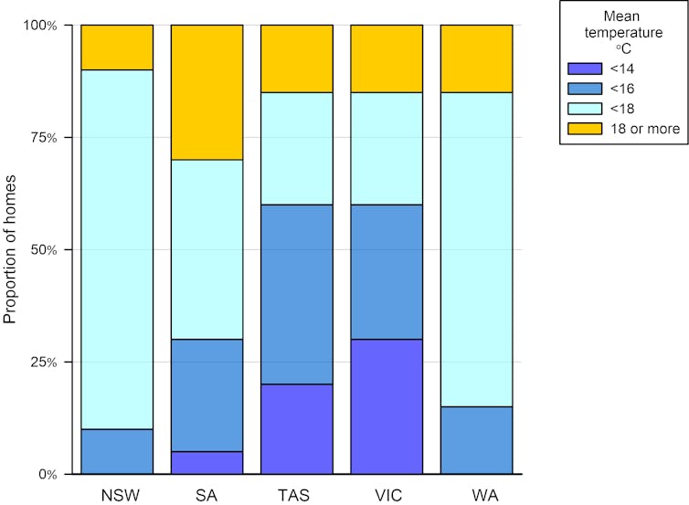 For our study, temperature sensors were placed in 100 homes across temperate New South Wales, South Australia, Tasmania, Victoria and Western Australia. Two-thirds of Australia’s population live in these temperate climate zones.