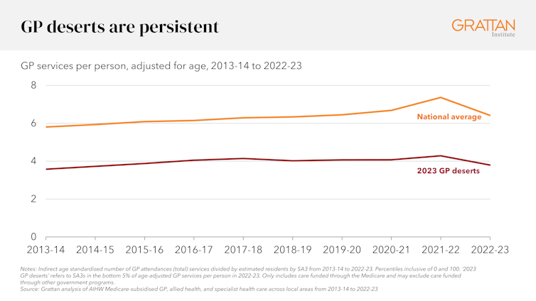 Lifting all GP deserts to the top of the desert threshold – or guaranteeing at least 4.5 GP services per person per year, adjusted for age, would cost the federal government at least A$30 million a year in Medicare payments.